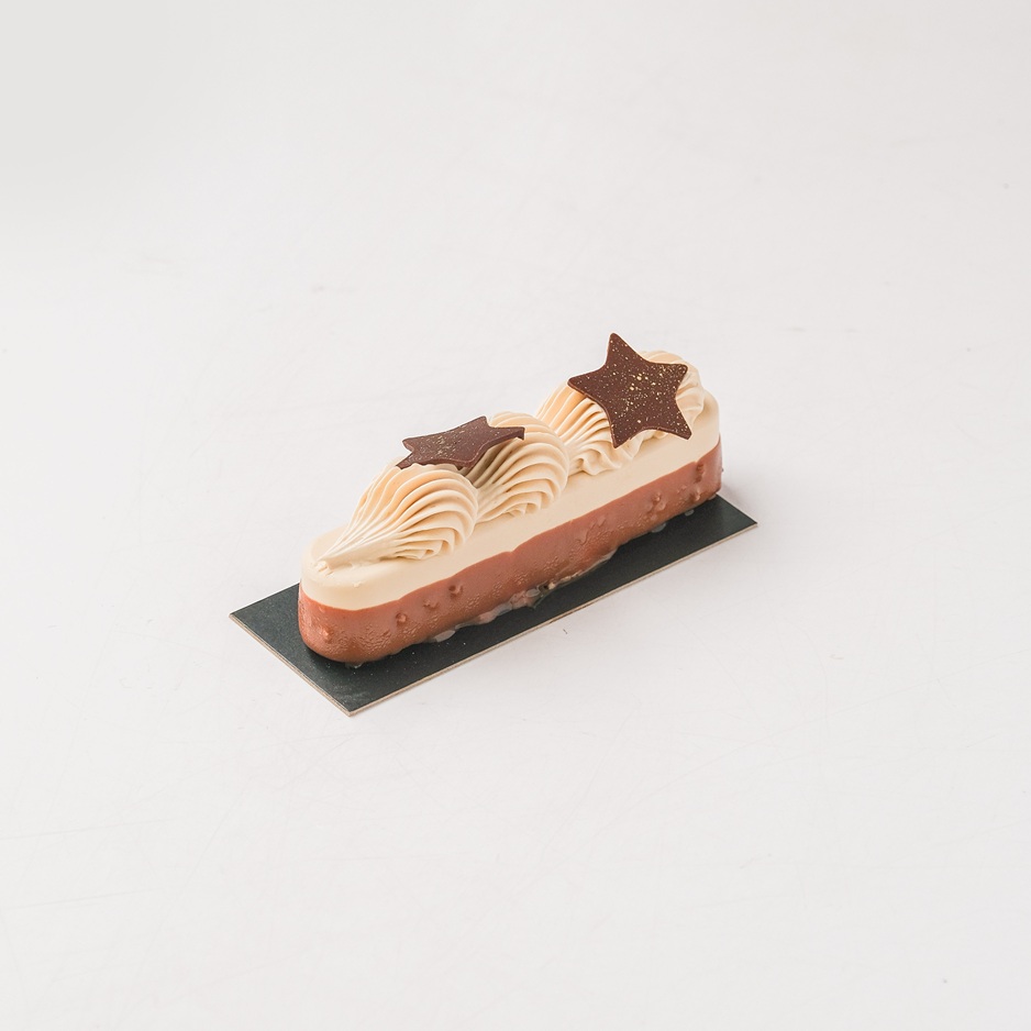 DESCRIPTION: Creamy gold chocolate mousse with a rich milk chocolate insert, coated in a crunchy milk chocolate rocher. Set on a moist chocolate brownie base and topped with a silky Baileys and gold chocolate cream.