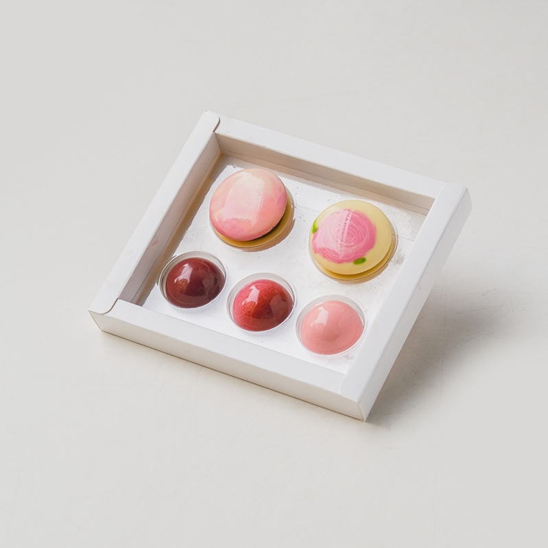 - Pralines: White chocolate with raspberry and pistachios; Dark chocolate with salted caramel; Dark chocolate with coffee.