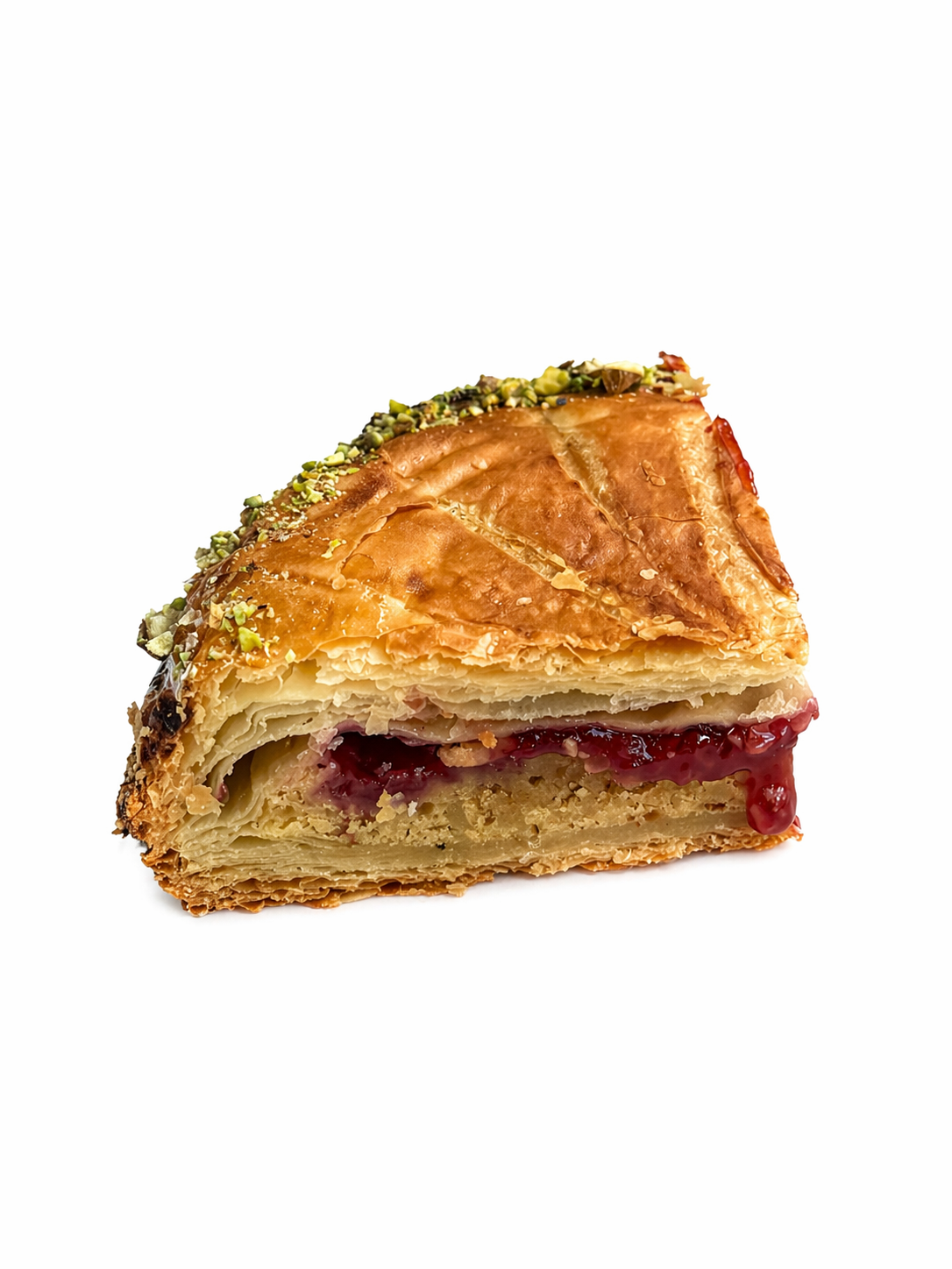 OPIS: Pita – kolač od domaćeg puterastog hrskavog lisnatog testa, po tradicionalnoj francuskoj recepturi, punjen franžipanom, malinom i belom čokoladom.